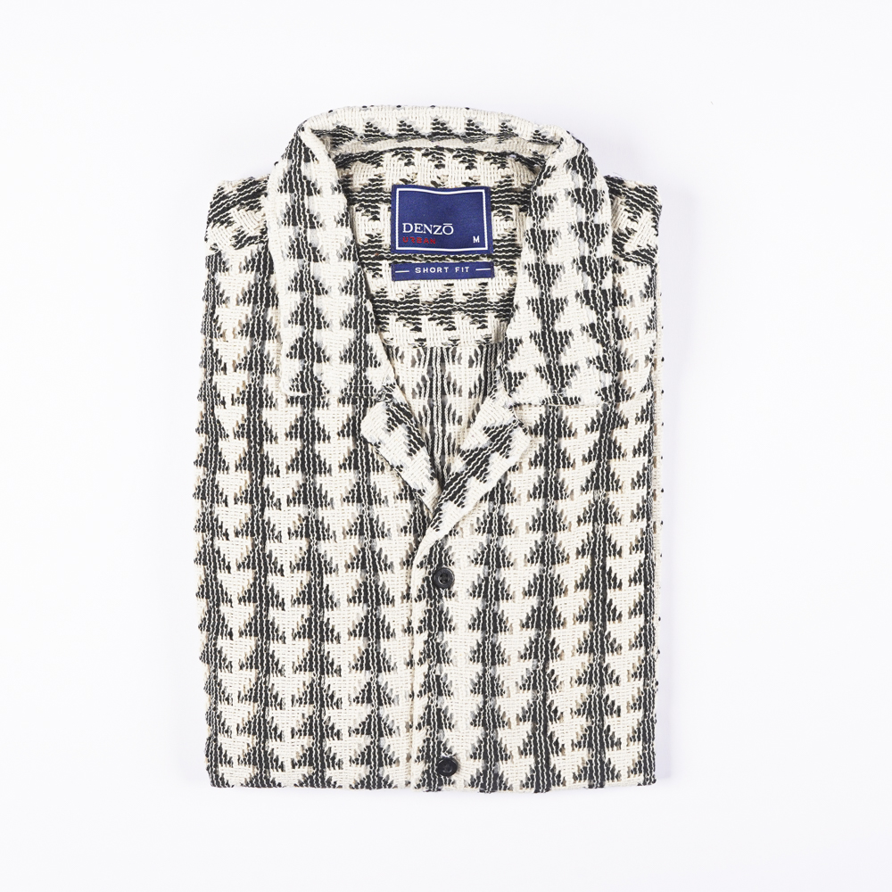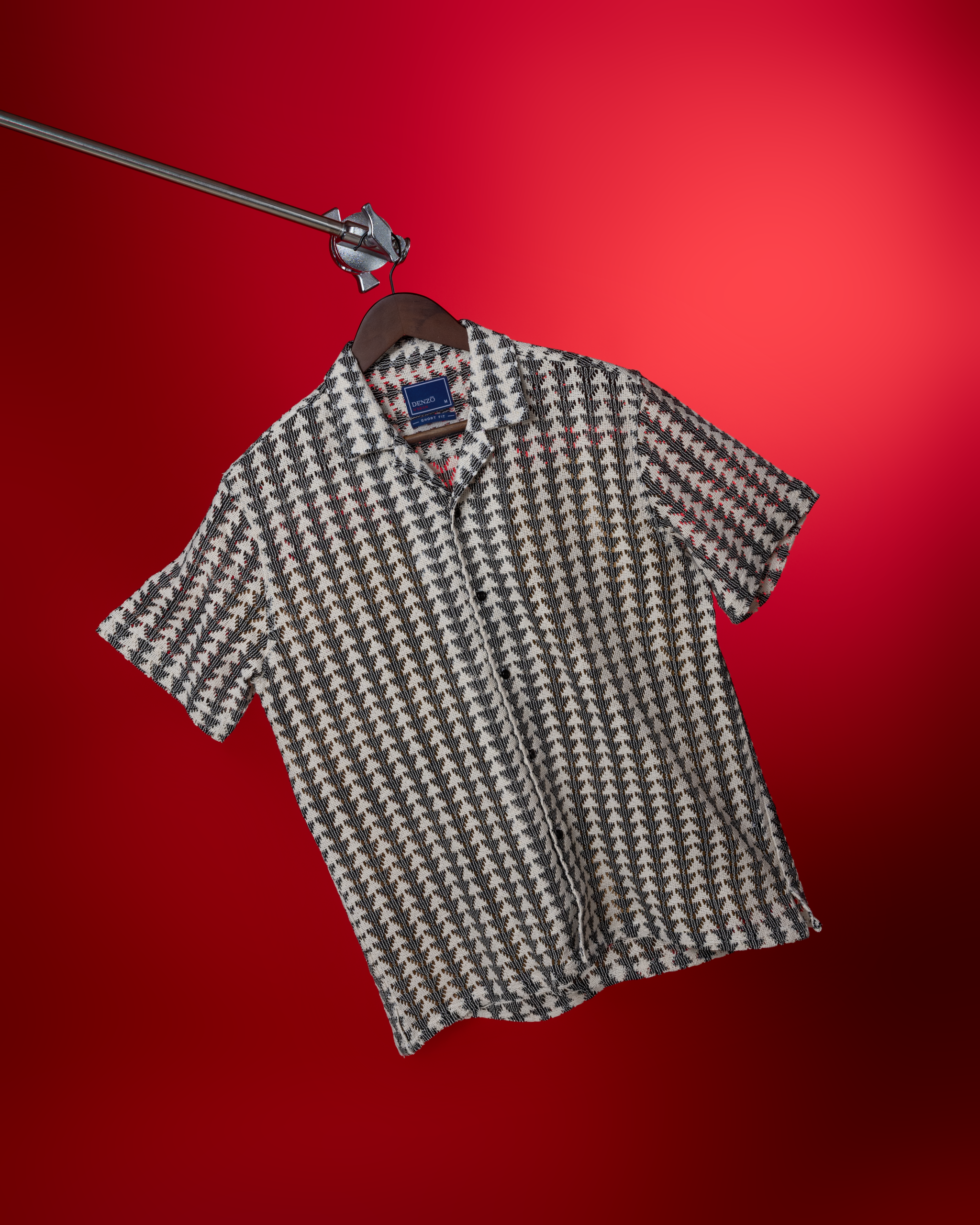 This shirt is designed with a Cuban collar (camp collar), characterized by its flat, open, and notched look, which adds a relaxed yet sophisticated resort- style vibe.