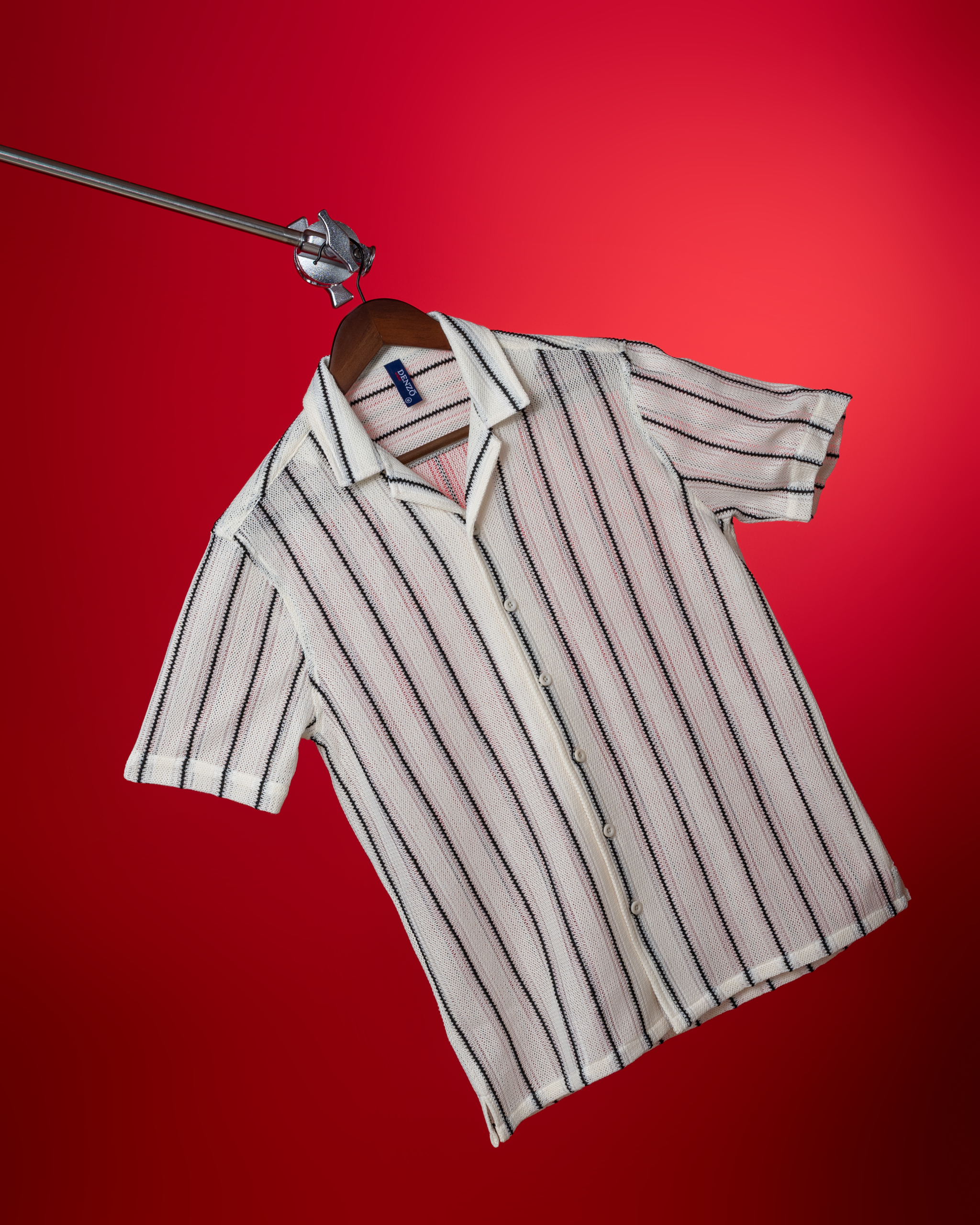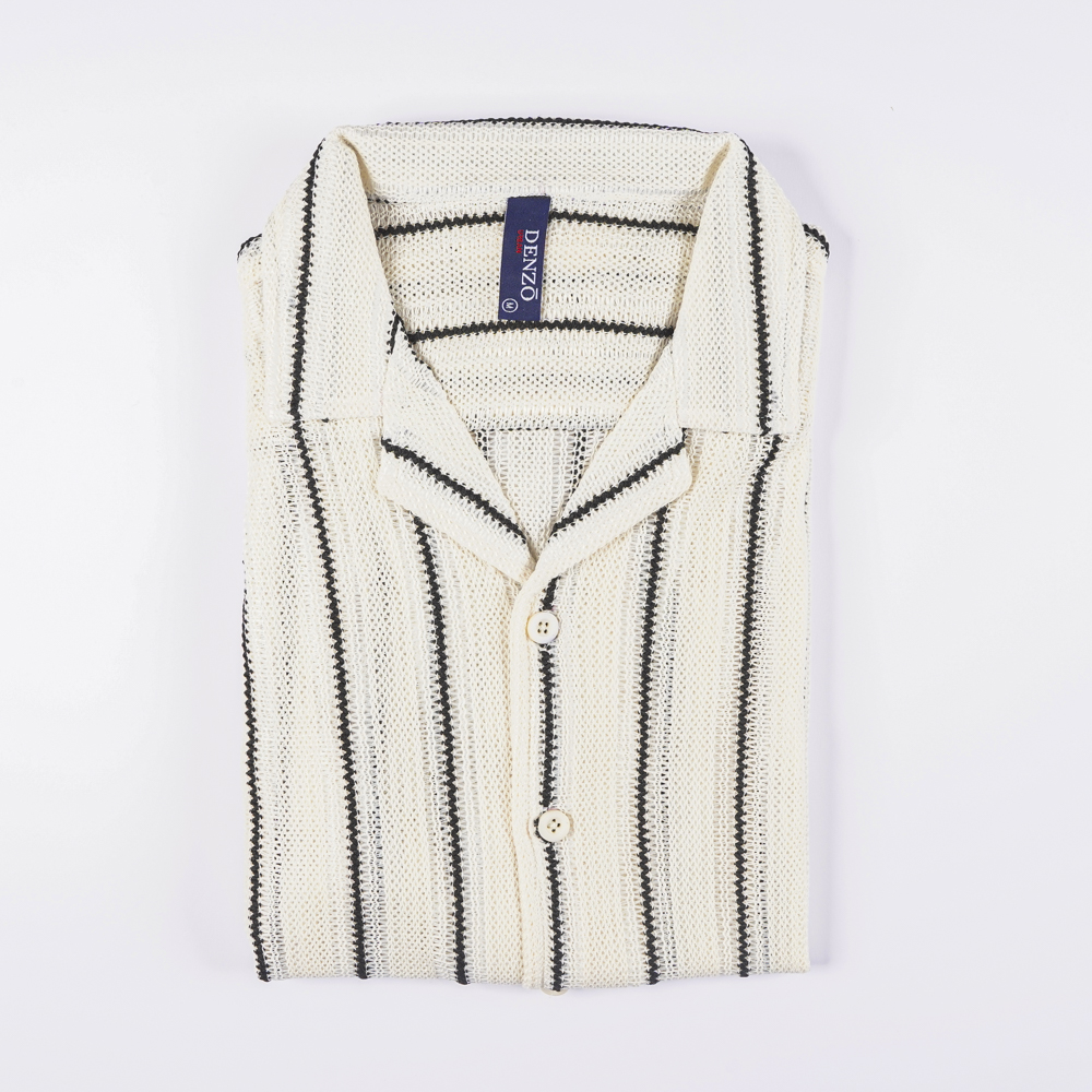 The shirt features a clean ecru (off-white) base with bold, dark vertical stripes. The stripes have a distinct, woven texture, giving the garment a refined, artisanal appearance.