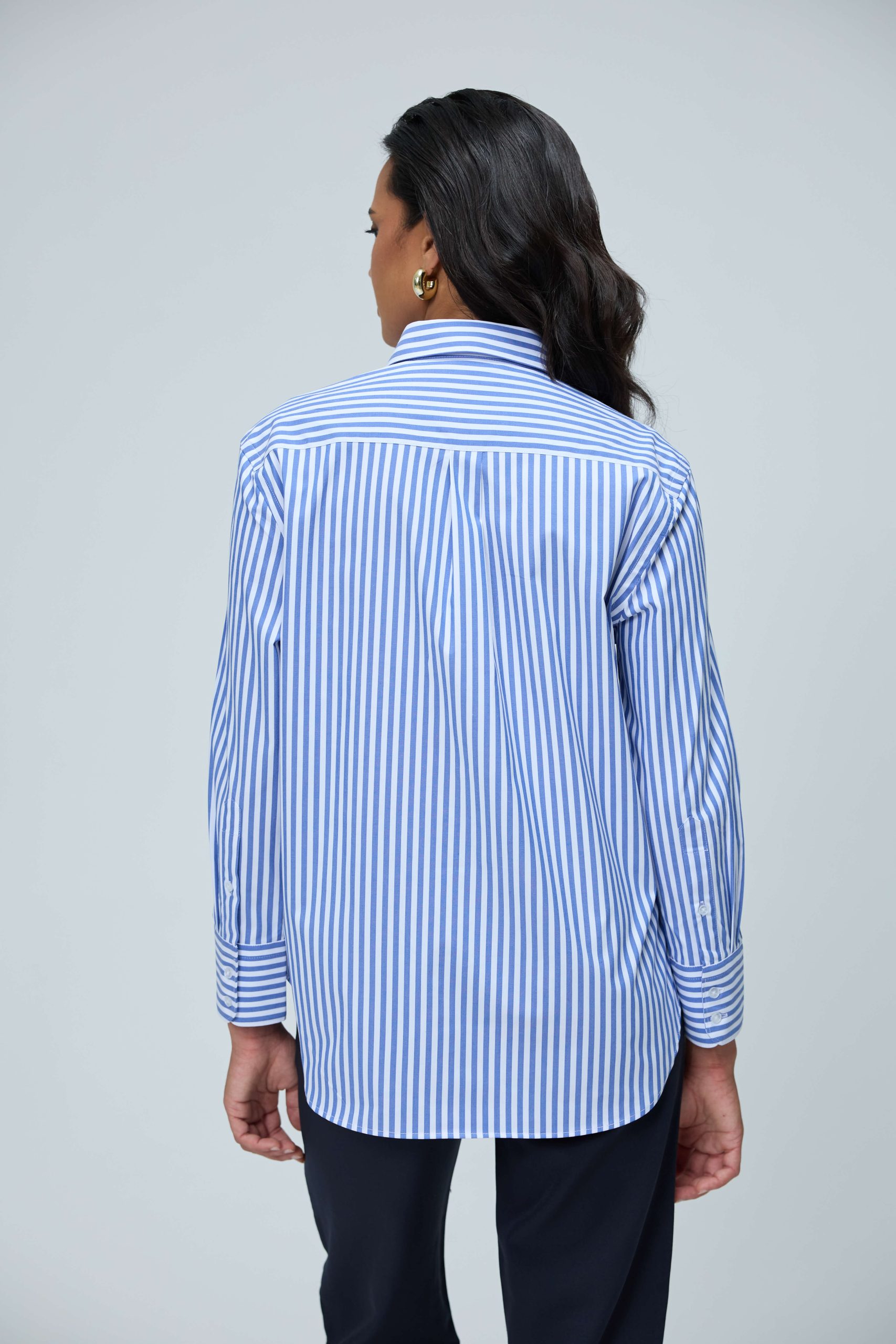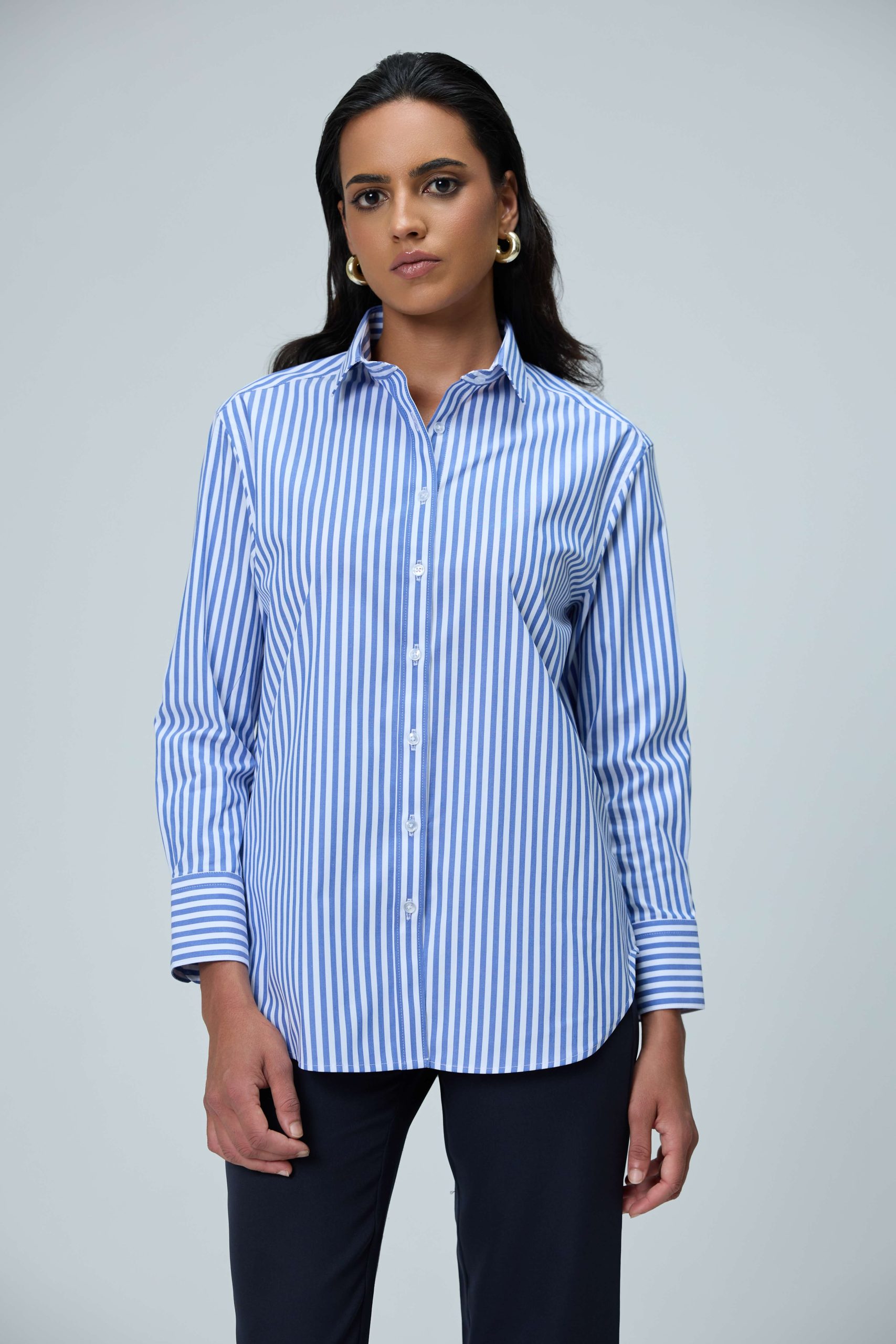 :100% CottonThis blue and white striped shirt is a versatile, long-sleeved garment designed with a contemporary classic or relaxed silhouette. Often categorized as a “boyfriend shirt,” this style blends a traditionally masculine cut with feminine elegance, making it suitable for both casual and smart-casual settings. The shirt is crafted from breathable materials such as 100% cotton featuring a crisp vertical pencil striped pattern.
