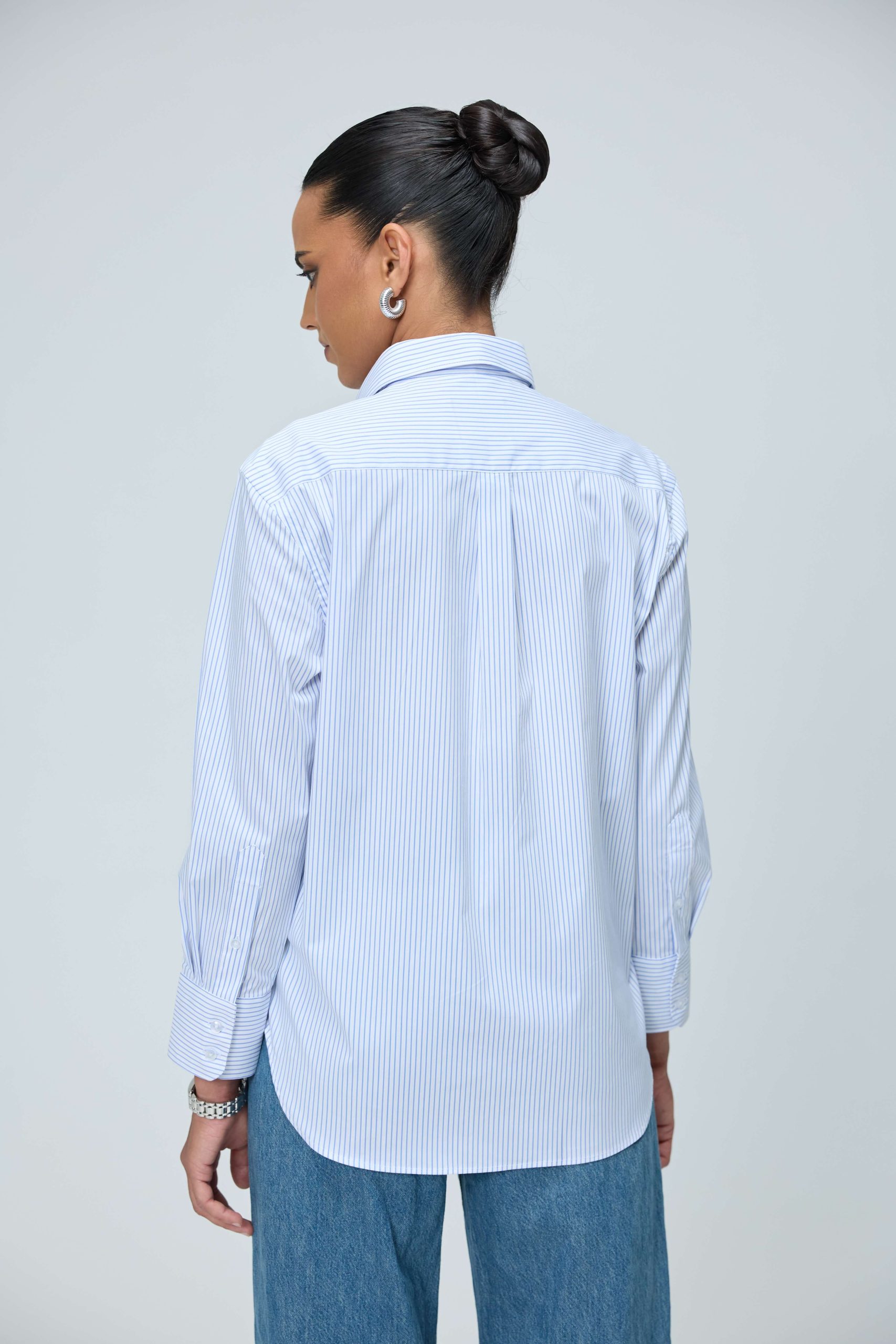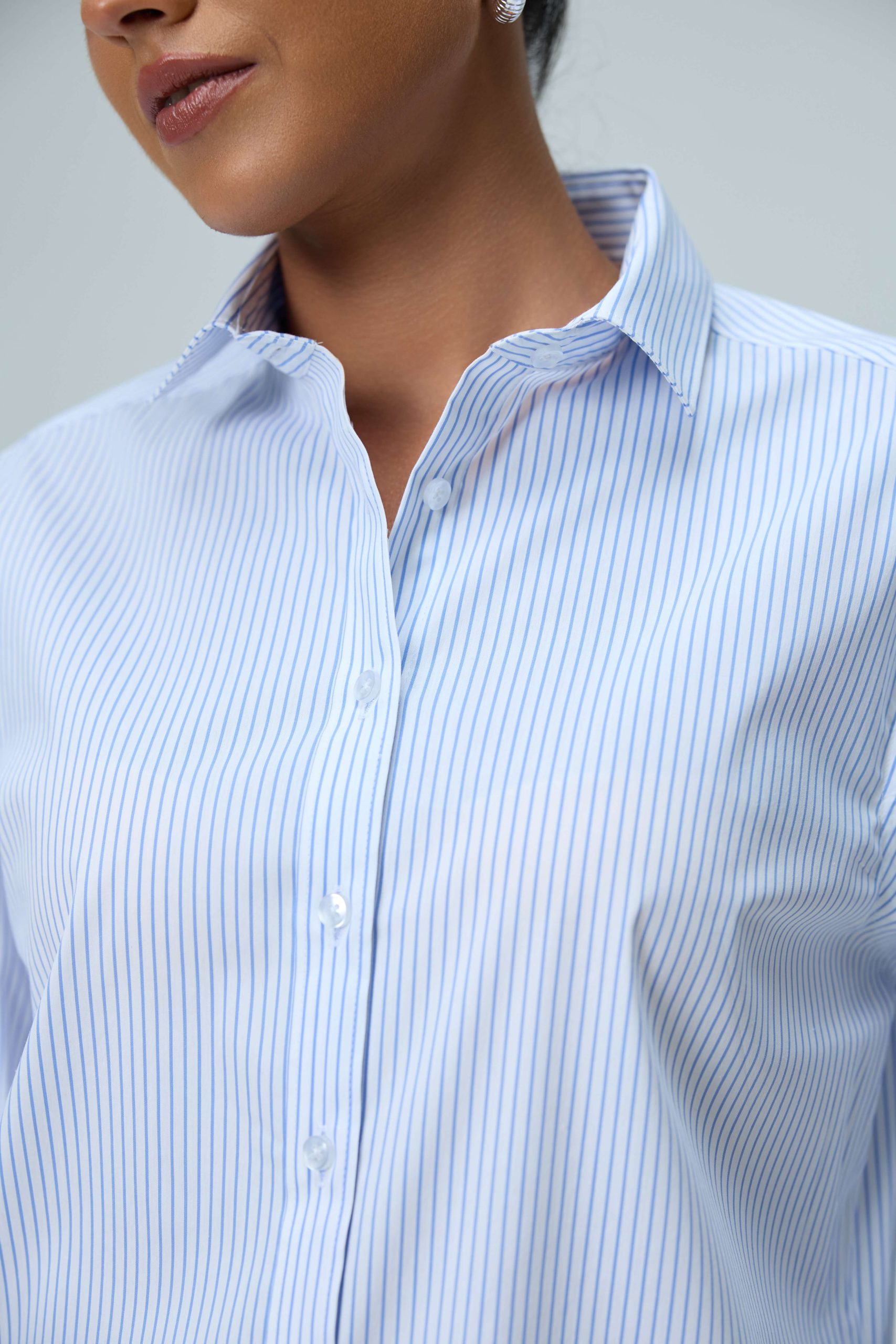 :100% CottonThis blue and white pinstriped shirt is a timeless wardrobe staple featuring a relaxed, longline silhouette. Crafted from lightweight 100% cotton fabric, it offers a crisp yet breathable feel suitable for both professional and casual settings.